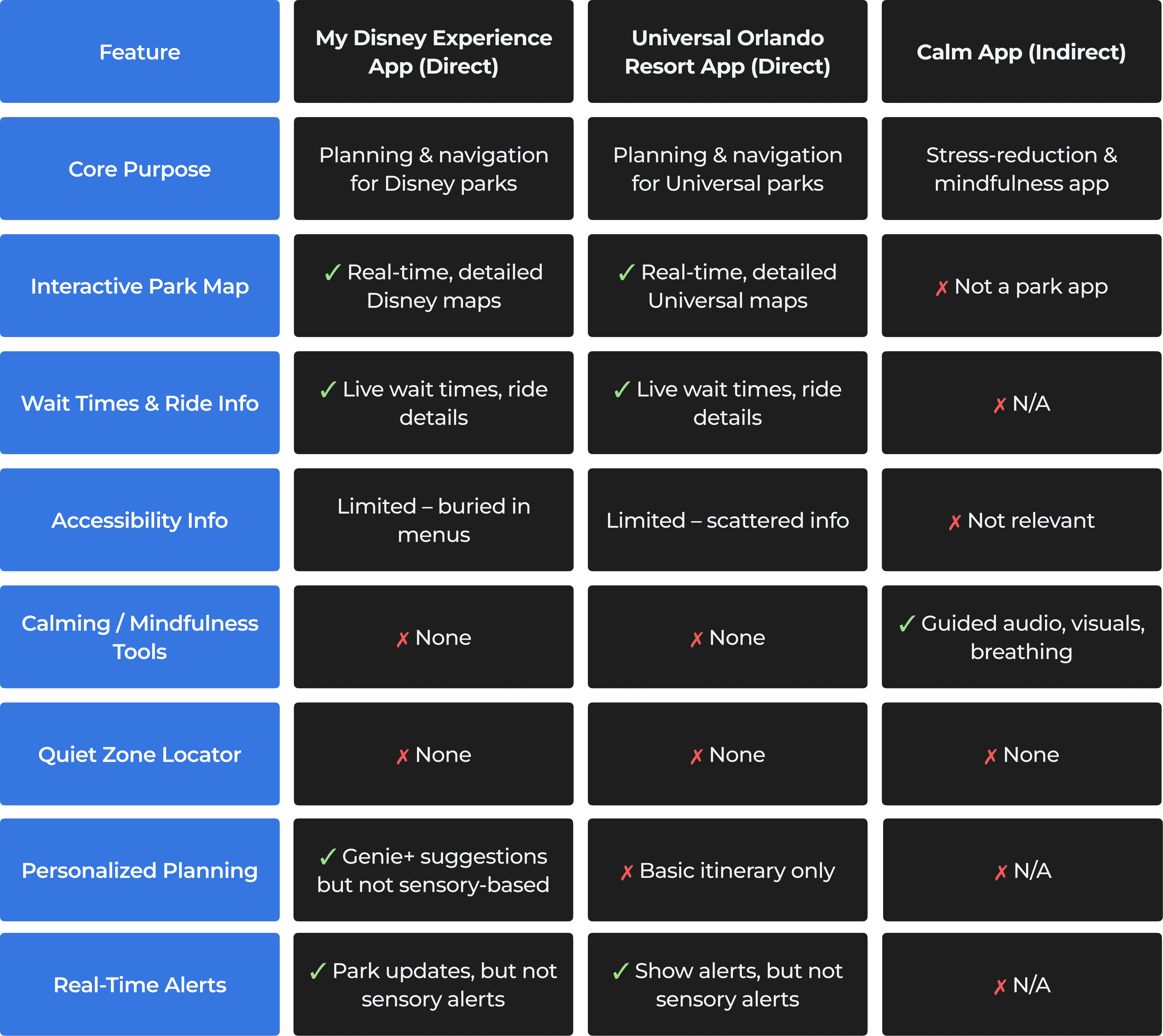 To understand how existing products address accessibility and sensory needs, I conducted a competitive audit of leading theme park and companion apps. This review highlighted gaps in navigation, personalization, and sensory-friendly features, giving me clear opportunities to differentiate ParkSight and better serve its users.